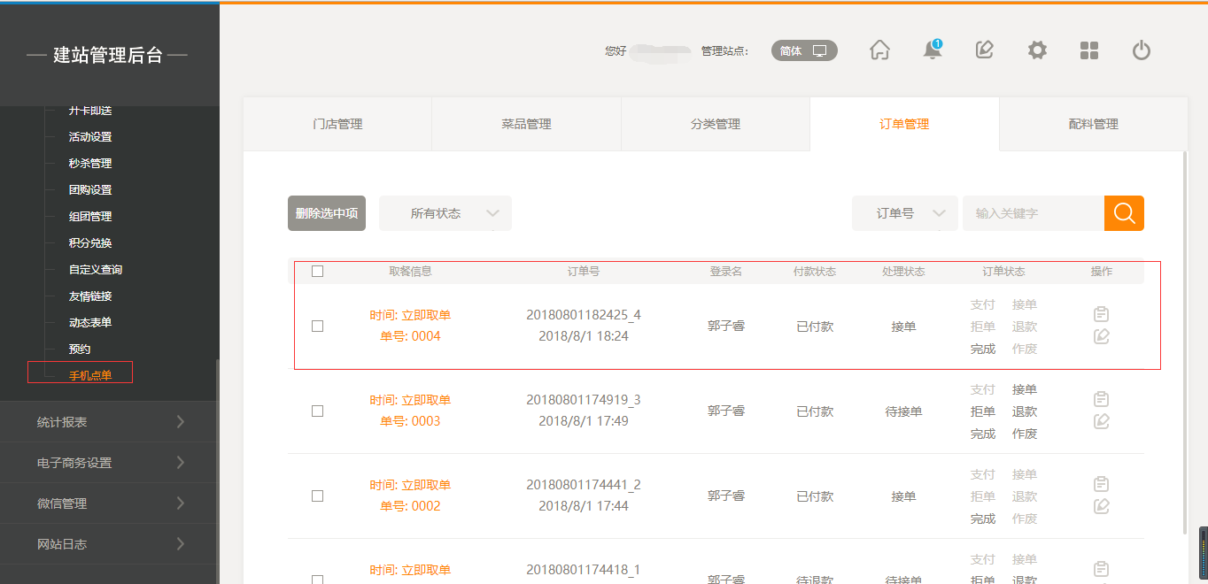 后台外卖订单界面