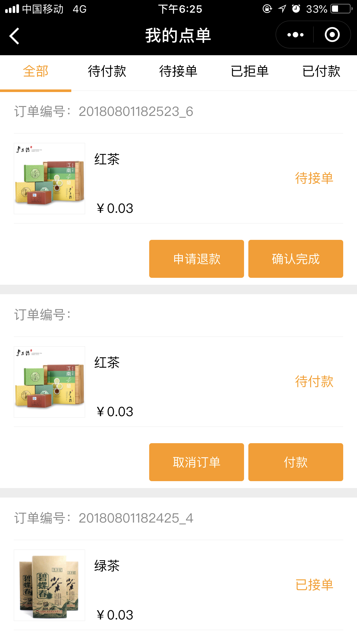 6.在后台“订单管理”中,当商家已经接单后,前台用户则不能申请“退款”,如果商家没有接单,则用户可以进行“申请退款操作”,如图所示: