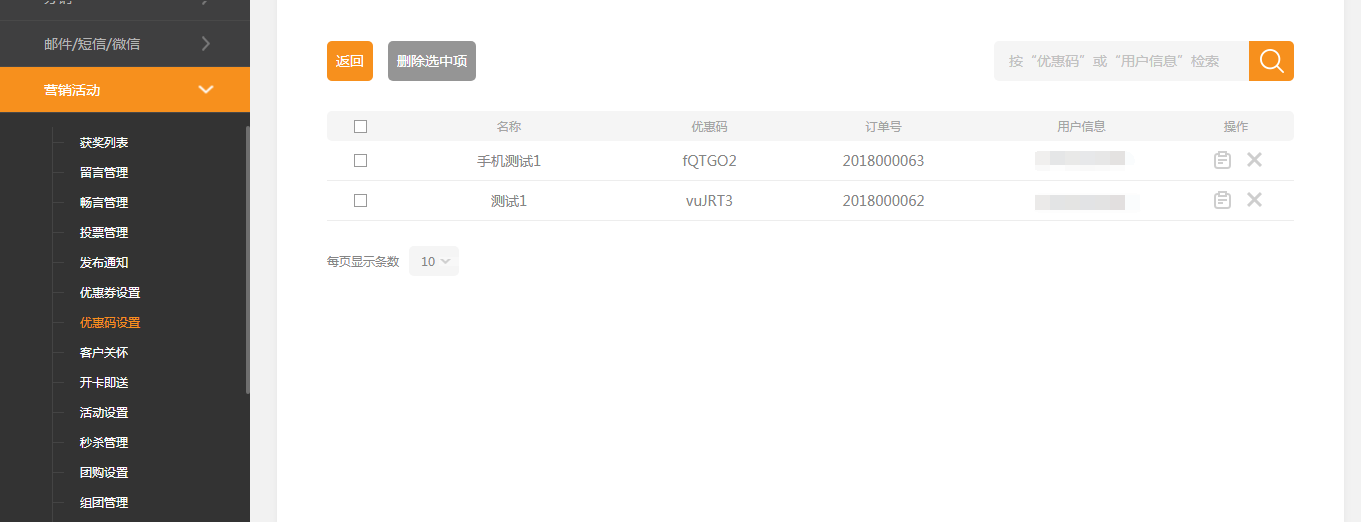 在建站后台-“营销活动”-“优惠码设置”中,可以对优惠码进行浏览、复制、导出等操作,如图所示: